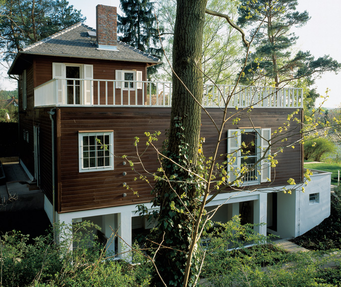 Evin mimarı, Konrad Wachsman bir başka “ünlü”. 1940 lı yıllarda Bauhaus’un kurucusu Water Gropius ile birlikte prefabrike konut üretimi ve pazarlaması üzerinde çalışmalar yapmıştır. Bu proje için, tabi ki, vazgeçilmez bir malzeme olan ahşap seçilmiştir.